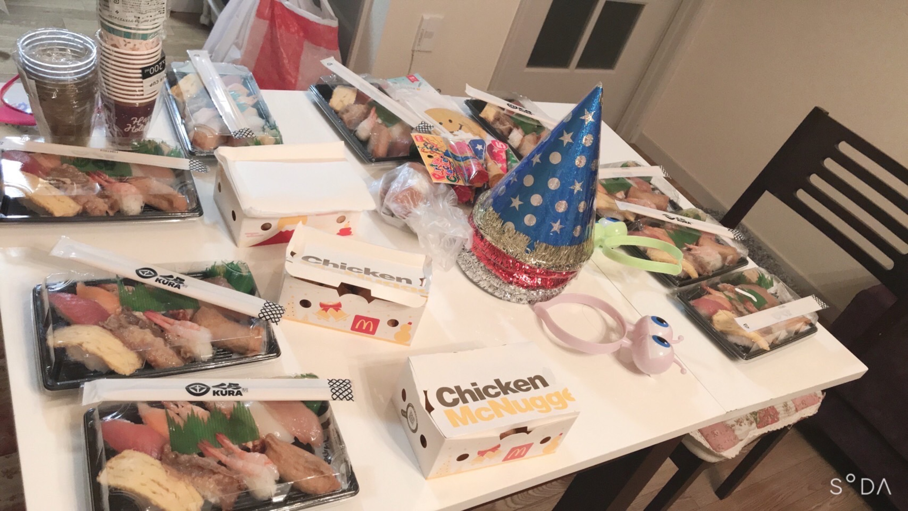 ピザやお寿司、チキンナゲット、ジュース...テーブルには色んな食事が並べられており、